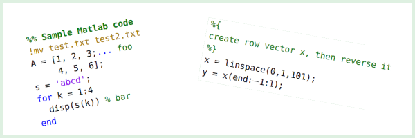 The package extends the facilities of the listings package, to pretty-print Matlab and Octave source code. (Note that support of Octave syntax is not complete.)