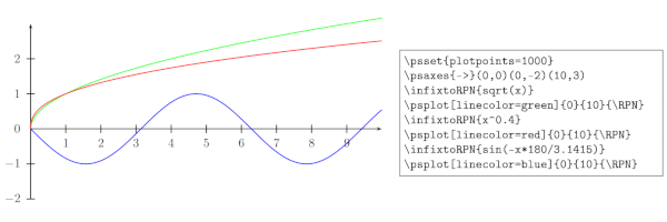 Plotting functions with pst-plot is very powerful but sometimes difficult to learn since the syntax of \psplot and \parametricplot requires some PostScript knowledge. The infix-RPN and pst-infixplot styles simplify the usage of pst-plot for the beginner, providing macro commands that convert natural mathematical expressions to PostScript syntax.