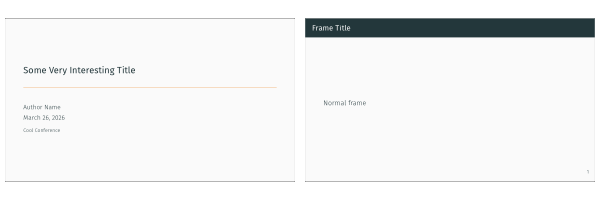 The package provides a simple, modern Beamer theme for anyone to use. It tries to minimize noise and maximize space for content.